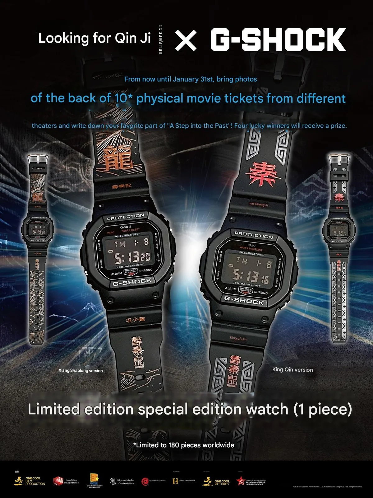 卡西欧 G-Shock x《回到过去》手表以黑色为主色调,设计灵感来自电影中的两个角色。项少龙版 DW-5600X 的表带细节为古铜色,并带有精细的笔触图案。秦王版 DW-5600X 则采用了金属红和银色的组合,边框为几何图案。两款手表均采用树脂表壳和表带,中央为深色背景数字显示屏。