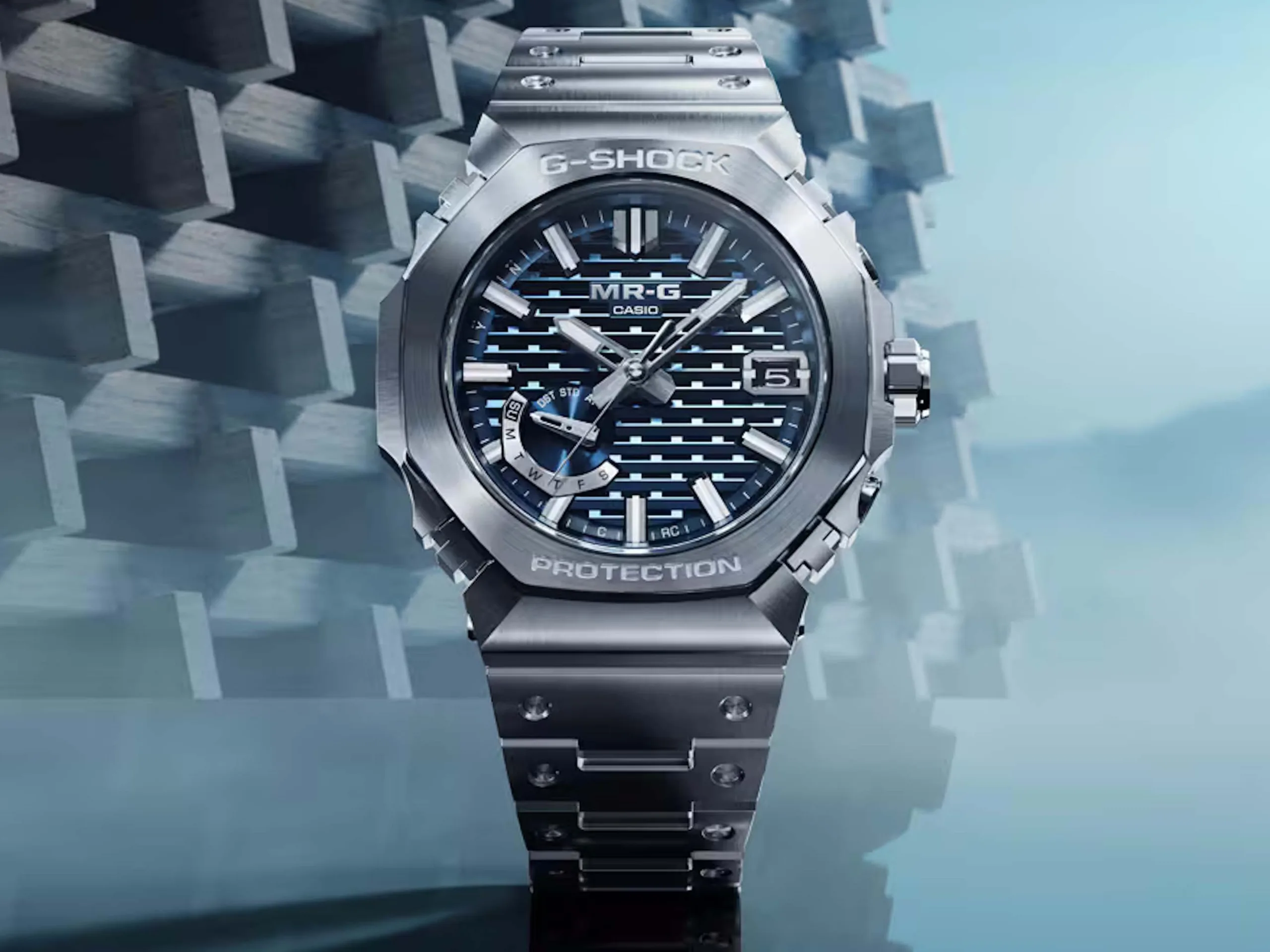 卡西欧 G-Shock MRGB2100D-2A 采用蓝色和银色设计,据说灵感来自日本东北地区最古老的宝塔。表盘为靛蓝色,带有几何图案和银色装饰,由蓝宝石水晶保护。表盘周围是银色的 Cobarion 表圈和碳化钛(TiC)饰面外壳,并配有配套的钛金属表链。