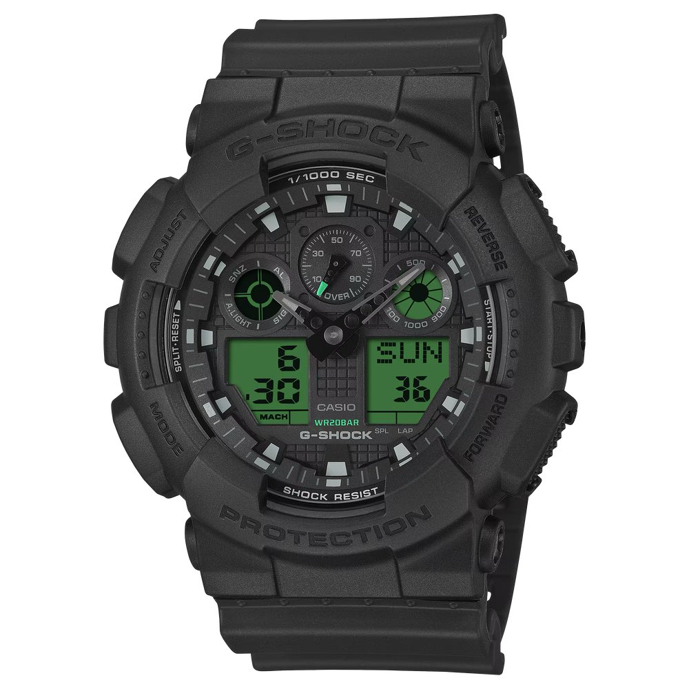 接下来是 GA-100BEG-1A(18,700 日元)。这款坚固耐用的数字模拟表采用了卡西欧经典的三显示布局,底部的双电绿色液晶面板与隐秘的黑色表壳形成鲜明对比。它拥有绿色尖端指针和小表盘装饰,将机械美学与坚固耐用的 JIS 1 级防磁和两年电池相结合。