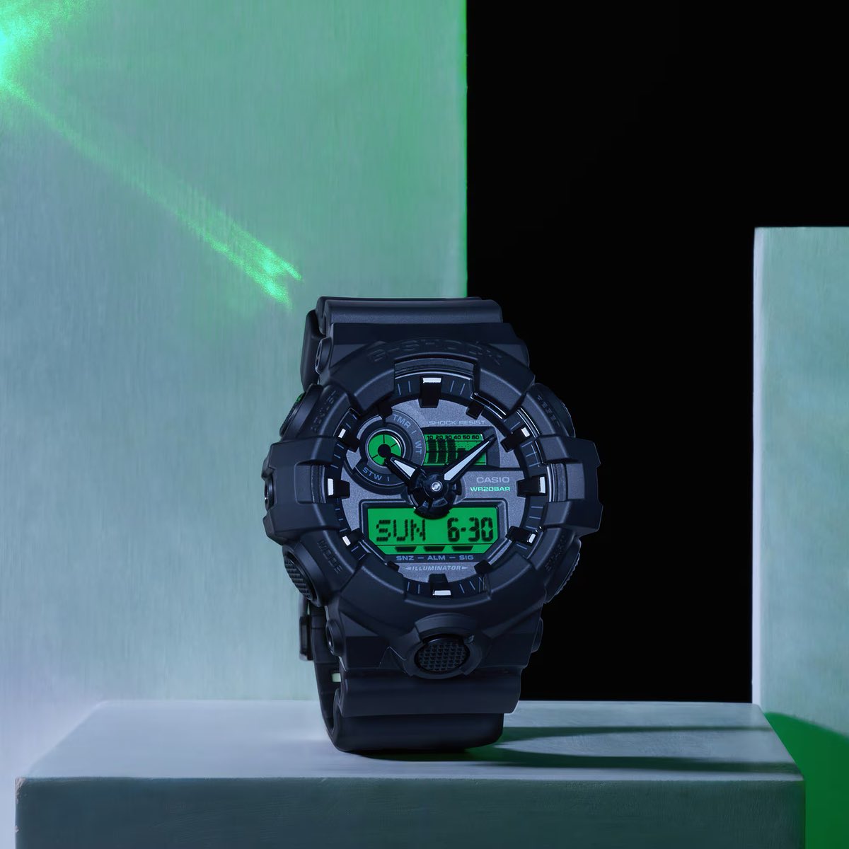 GA-700BEG-1A 的外形明显更加大胆,采用了极具侵略性的树脂保险杠和突出的纹理前灯按钮。它没有采用双截面屏幕,而是使用了一块简洁的电镀绿色液晶显示屏,搭配大型 3D 指针和圆形小表盘。它放弃了防磁屏蔽,但配备了五年电池。它的售价为 18,700 日元,与 GA-100BEG 相同。