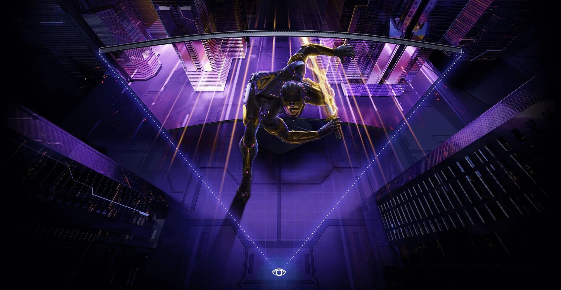 后面板设计醒目,具有 RGB 照明功能。这里有两个 HDMI 和 DisplayPort 端口,但没有 USB 端口。显示器可通过附带的支架调节高度、旋转和倾斜,还可通过 VESA 安装在墙壁支架或显示器臂上。最后,该显示器的曲率半径为 1,500 毫米。