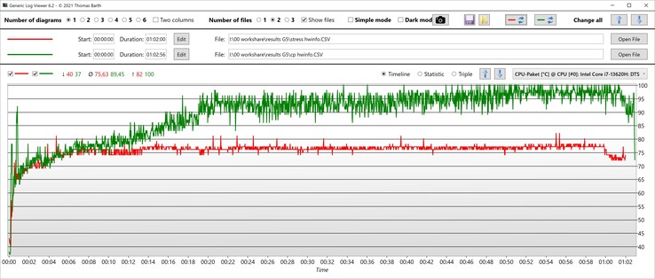 然而,散热系统并不尽如人意:如果 CPU 在游戏过程中持续达到 100 °C,这未必有利于硬件的耐用性。难怪这款笔记本电脑的噪音也相当大。这可能是我们测试机型的问题,但前代机型也曾遇到过温度问题。我们不明白技嘉为什么不在两代笔记本电脑之间修复这个薄弱环节。如果制造商发现我们的机型存在故障,我们将更新测试结果。