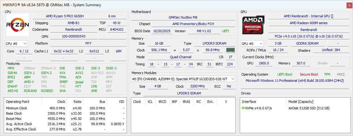 | GMK NucBox M8 AMD Ryzen 5 PRO 6650H ⎘ AMD Radeon 660M ⎘ 16 GB Memory, 512 GB SSD | Amazon: $479.99 | 494 g | 63 mm | x | |