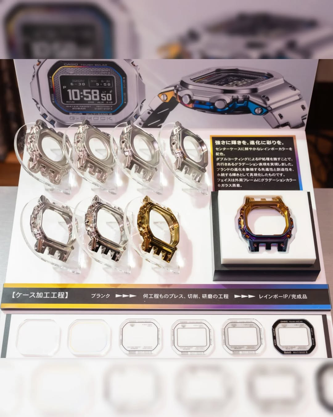 其中一张清晰的照片还展示了表壳的分层结构。多个未加工的金属外壳与经过彩虹处理的完整表壳并排展示,以展示多步骤的加工和精加工过程。侧面轮廓显示了另一个以前不太明显的细节。与旧款 GMW-B5000 相比,表圈、表壳和内部结构显得更加分段。抛光钢表面与彩色内框之间的过渡非常明显。螺丝和按钮的色调也略有不同。