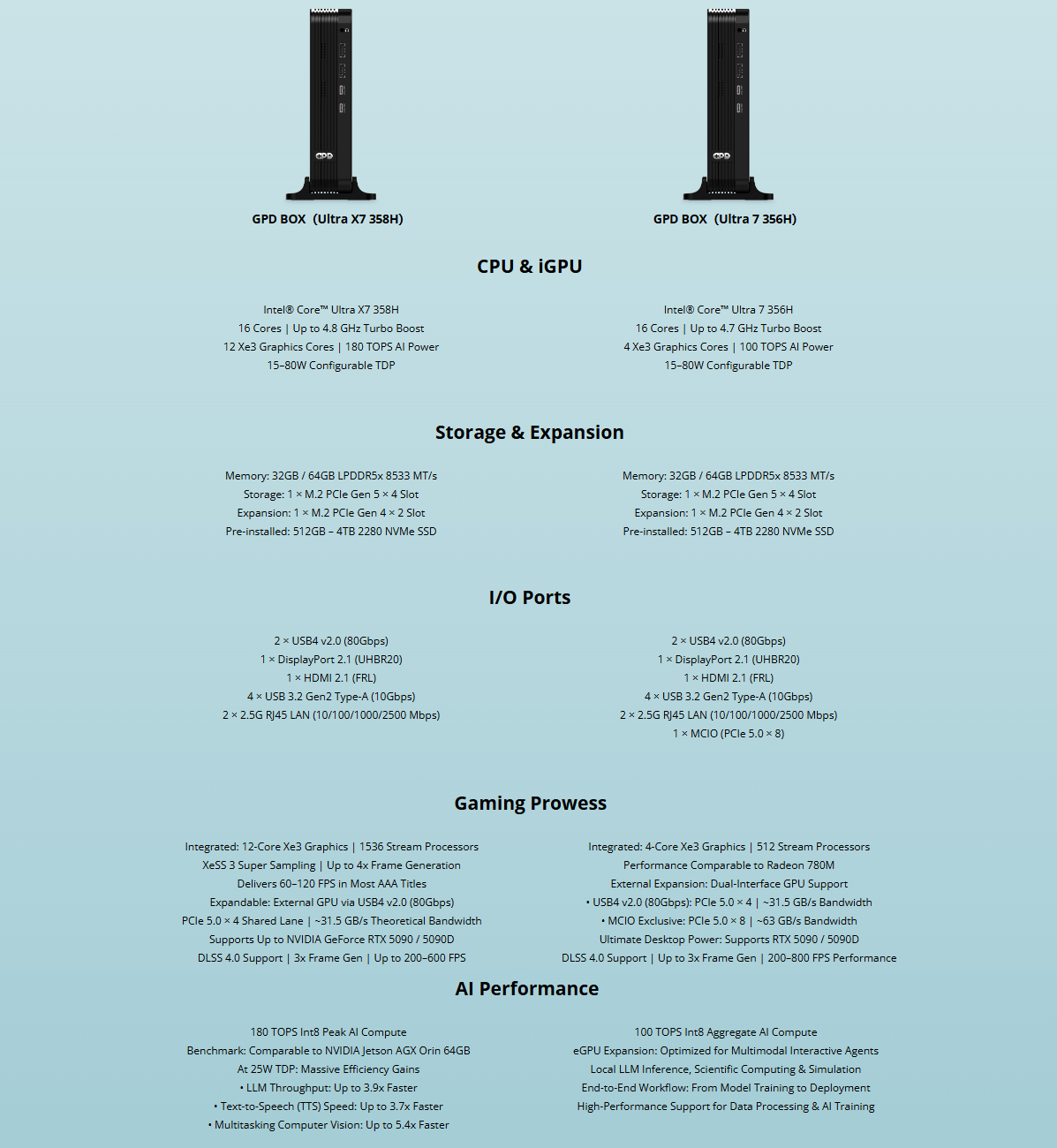 现在,该公司分享了 GPD Box 的更多规格。据该公司证实,这款迷你 PC 将采用英特尔 Panther Lake CPU。具体来说,将有两种选择:一种是采用 英特尔酷睿至尊 X7 358H和 Core Ultra 7 356H。