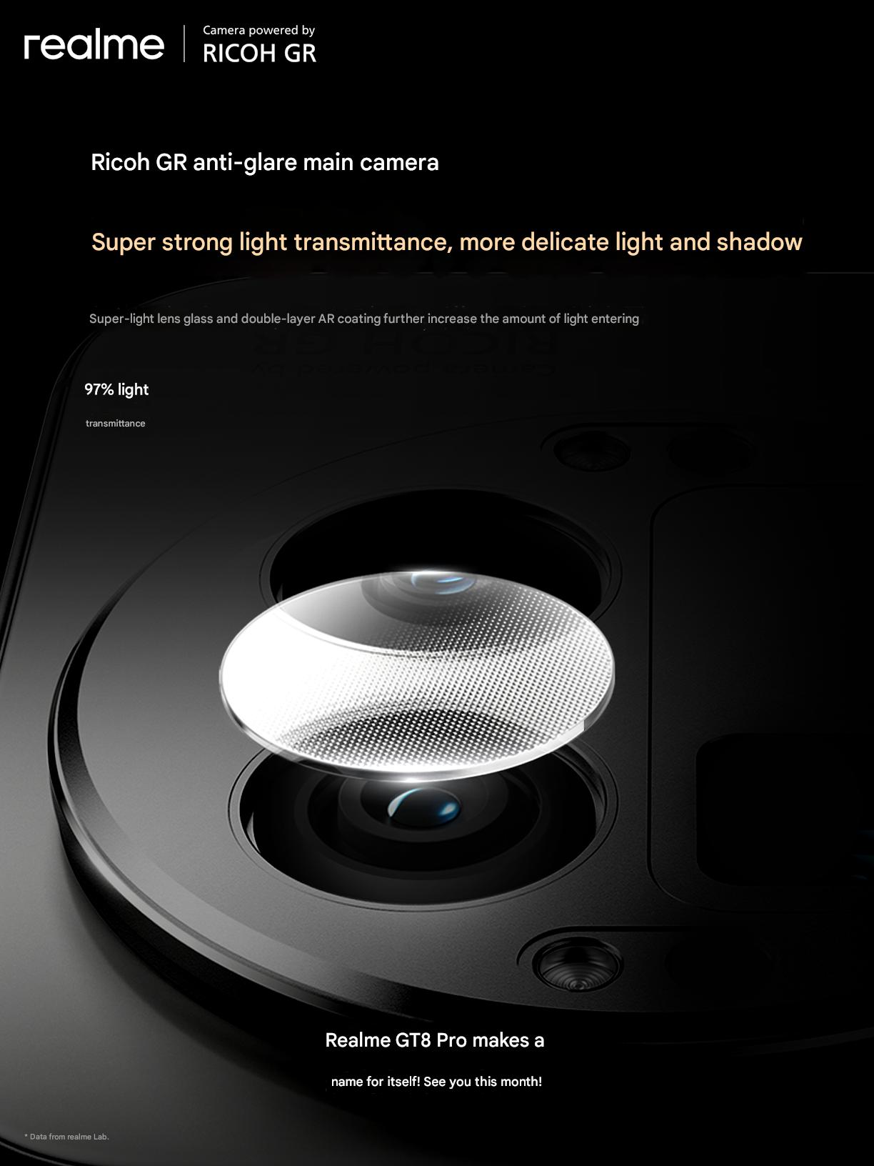 Realme GT8 Pro 的主摄像头可能会保留 23 mm 镜头,同时提供通过相机应用程序切换到 28 mm 或 40 mm(理光 GR IIIx 中引入)的选项。这两个焦段尤其适合街拍,而理光 GR 在这方面历来具有很高的权威性。此外,还将加入取景器模式。最近在微博上分享的官方预告中和X上分享的官方预告中,Realme 透露 GT8 Pro 配备了 "防眩光 "镜头--类似于 vivo 旗舰上的蔡司 T* 镀膜--以减少反光等不必要的伪影,并提供细节丰富、色彩鲜艳的快照。