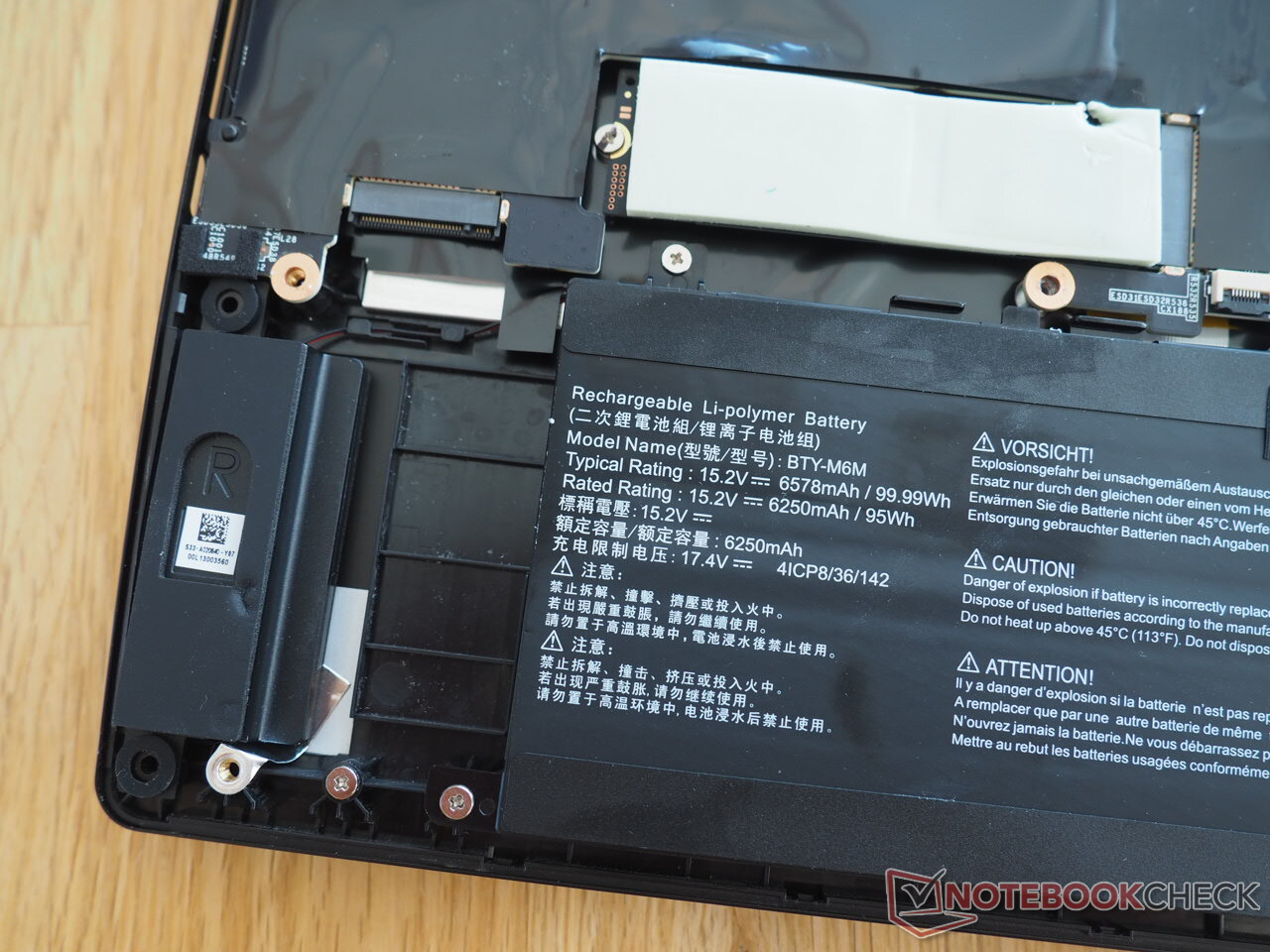 维修选项相当令人失望。那些打破机箱底部的原厂封条并卸下15颗十字头螺钉的人确实可以掀开整个底盖,但由于存在巨大的胶合铝箔表面,里面只有风扇、电池、M.2插槽和无线模块可以接触。CPU或GPU的冷却系统和内存则不容易接触到。这是不必要的,其他制造商已经用更好的方式解决了这个问题。