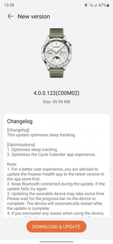 从下面的截图来看,华为改进了睡眠跟踪功能,但没有详细说明。同样,华为还声称 HarmonyOS 4.0.0.122 (C00M02) 以未知的方式优化了 "周期日历 "应用。作为参考,你可以在已配对的智能手机上进入华为健康应用,点击 "设备",然后点击 "更新",检查更新是否已准备好下载。手表 GT 4最后点击 "固件更新"。