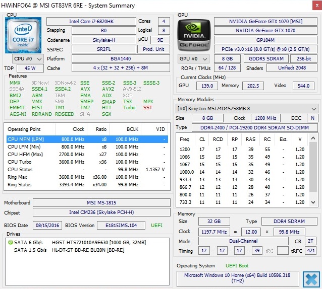 | MSI GT83VR-6RE32SR451 GeForce GTX 1070 SLI (Laptop), 6820HK | Schenker XMG U727 GeForce GTX 1080 SLI (Laptop), 6700 | MSI GT80S 6QF GeForce GTX 980 SLI (Laptop), 6820HK | Eurocom Sky X7E2 GeForce GTX 1080 Mobile, 6700K | Asus G752VS-XB78K GeForce GTX 1070 Mobile, 6820HK | |