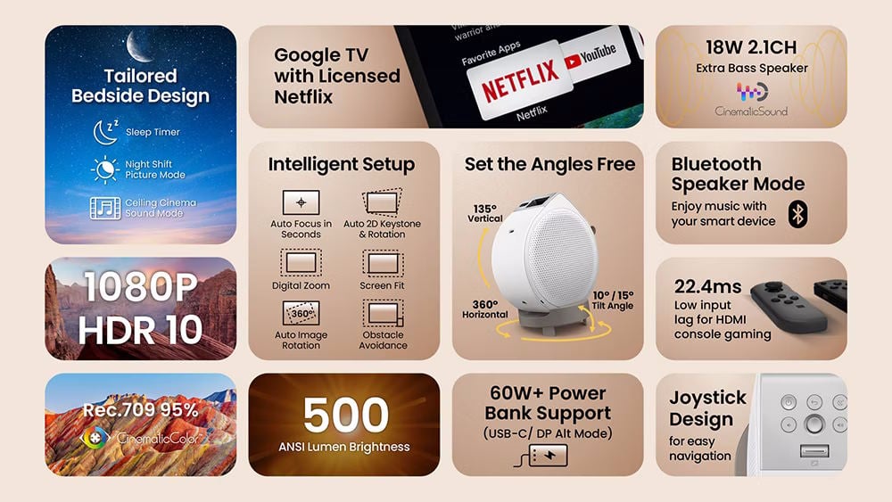 GV32 的投影距离并不特别短,仅为 1:1.2,因此投影对角线为 60 英寸需要 1.5 米的距离,120 英寸则需要 3.2 米。不需要外置播放器,因为随附的 Google TV 可用于播放 Netflix 或 YouTube 上的内容。支持 WiFi,还可以使用 60 瓦的蓄电池。图像内容也可通过 USB-C 传输。据宣传,GV32 的输入延迟为 22.4 毫秒,适合与游戏机一起使用。智能功能旨在简化设置,减少工作量。在美国,该机型的售价为 599 美元。.其他市场的上市信息尚未公布。