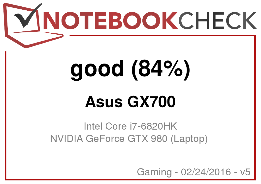 | Asus GX700 GeForce GTX 980 (Laptop), 6820HK | MSI GT72S 6QF GeForce GTX 980 (Laptop), 6820HK | Schenker XMG U726 GeForce GTX 980 (Laptop), 6700 | Schenker XMG U716 GeForce GTX 980 (Laptop), 6700 | Schenker XMG U706 GeForce GTX 980M, 6700K | Schenker XMG P706 GeForce GTX 980M, 6820HK | Asus G752VT GeForce GTX 970M, 6700HQ | |