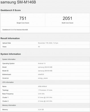 前者是 与前者与A14 5G有关,而后者更新颖,可能是某些市场的模拟产品。 一些市场称为M14 5G。它们的可比分数是由完全相同的规格实现的。4GB的内存,一个 Android 基于13操作系统和一个不知名的"s5e8535"平台,有8个核心,频率高达2.4GHz。