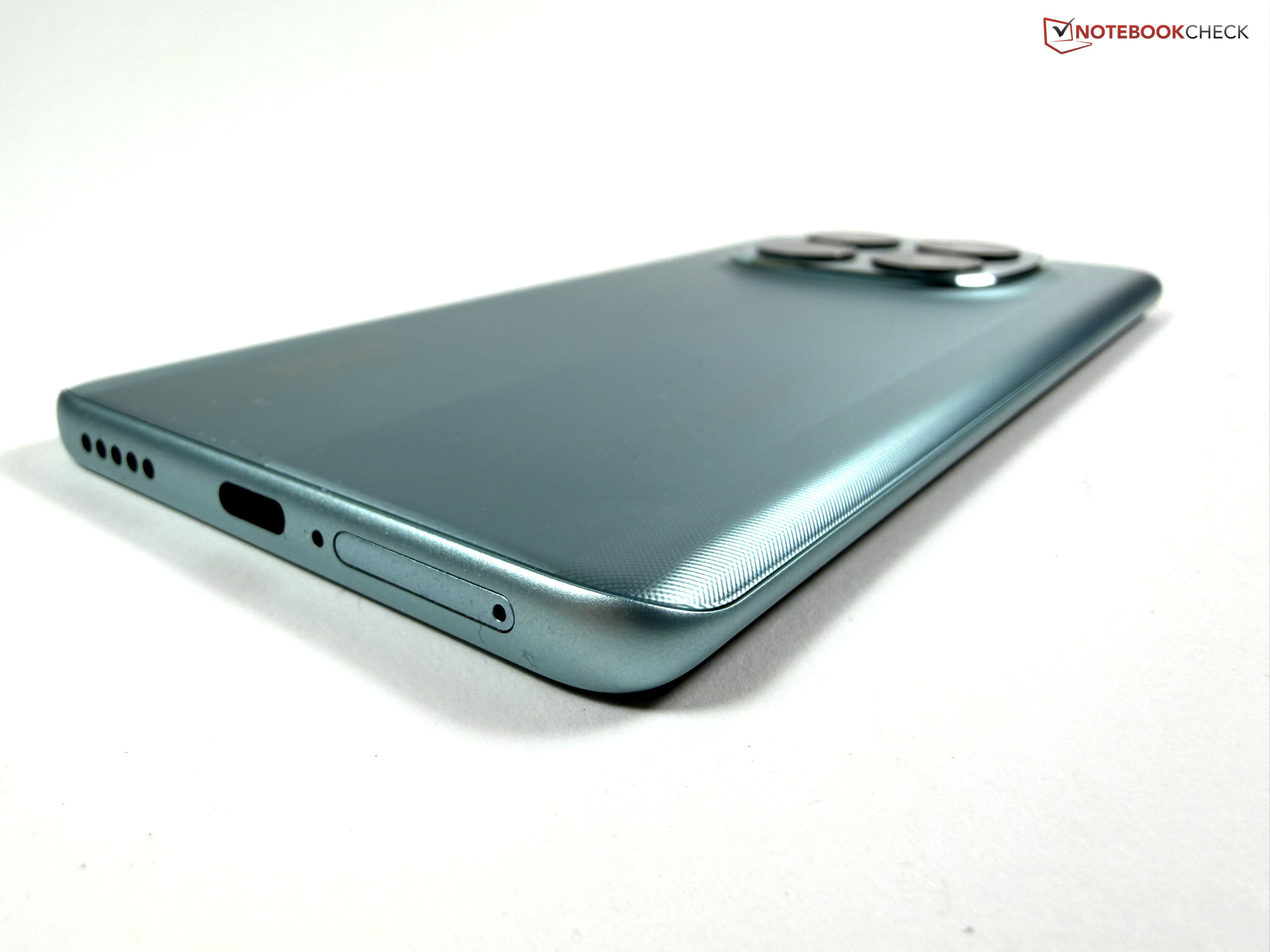 小米将 Poco M8 5G 装入坚固轻巧的塑料外壳中。圆润的长边使后盖和显示屏看起来天衣无缝。不过,出厂时贴上的屏幕保护膜起到了触觉制动的作用,因为弧形设计可以明显感觉到它的存在。