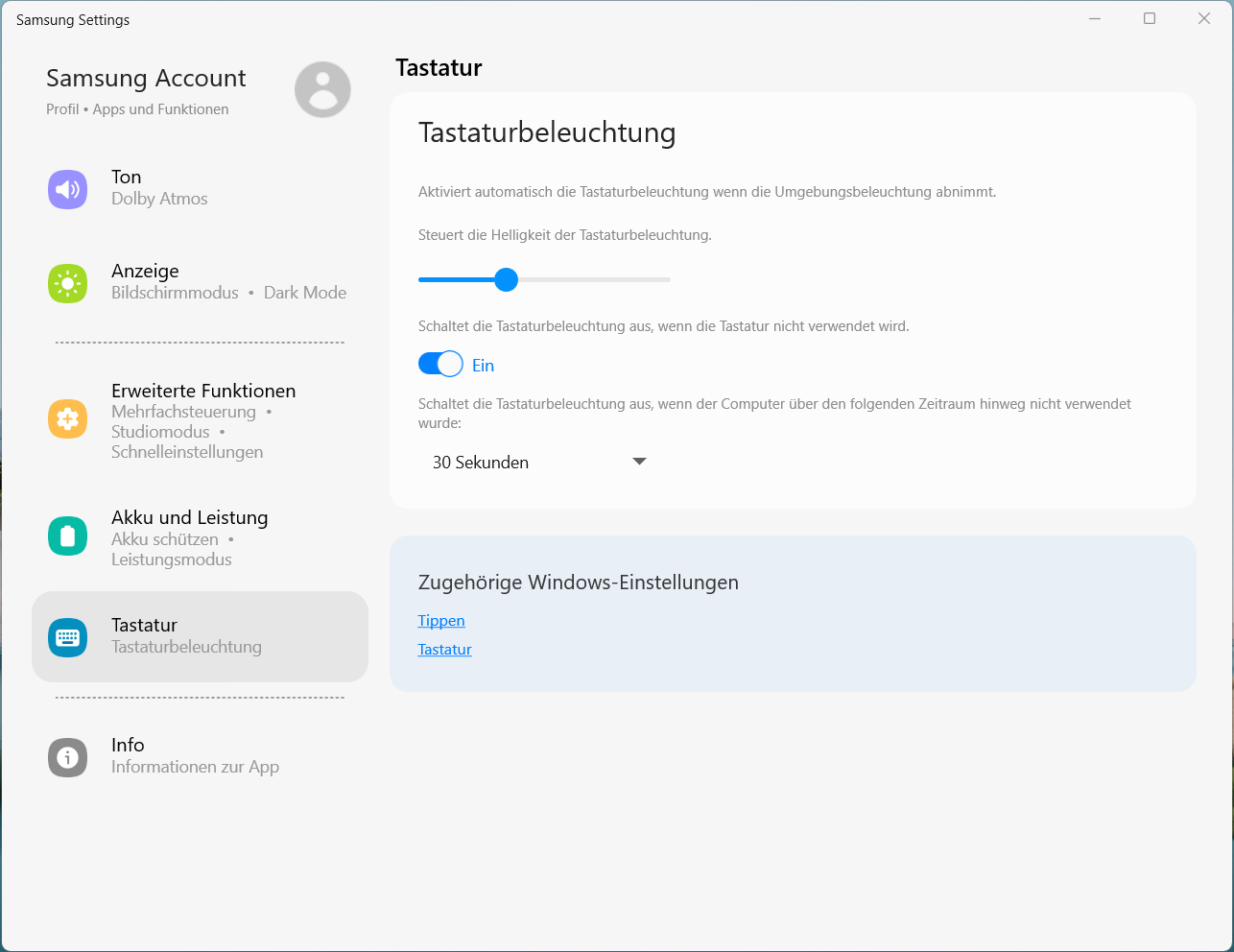 背光小键盘的光滑按键行程短,压力点明确。键盘提供的阻力是可以接受的,而且键盘在打字过程中不会屈服。三段式按键照明是通过一个功能键控制的。总的来说,三星在这里提供了一个适合日常使用的键盘。
