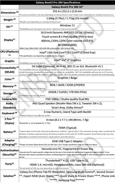 Galaxy Book3 Pro 360上的I/O很稀少,包括两个Thunderbolt 4.0端口,一个USB Type-A端口,一个HDMI 1.4端口,一个SD读卡器和一个可选的nano SIM卡插槽。无线连接选项包括Wi-Fi 6E和蓝牙5.1。内存和存储最大为32GB LPDDR5和1TB。指纹传感器被植入电源按钮,允许生物识别认证。