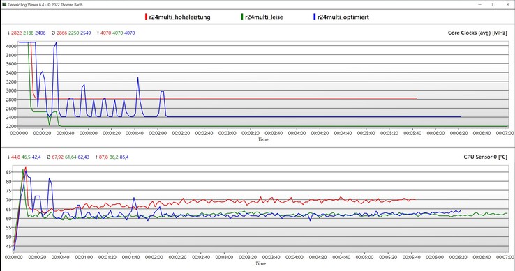 三星设置中有三种不同的能源配置文件:安静、优化和高性能。默认情况下,优化配置文件处于激活状态,我们在以下测量和基准测试中也使用了该配置文件。在高性能模式下,只有笔记本电脑的多核性能获益(单核和 GPU 与较弱的配置文件几乎相同),我们也使用该模式运行了 CPU 基准测试,但风扇的声音明显增大,与性能的提高不成正比。