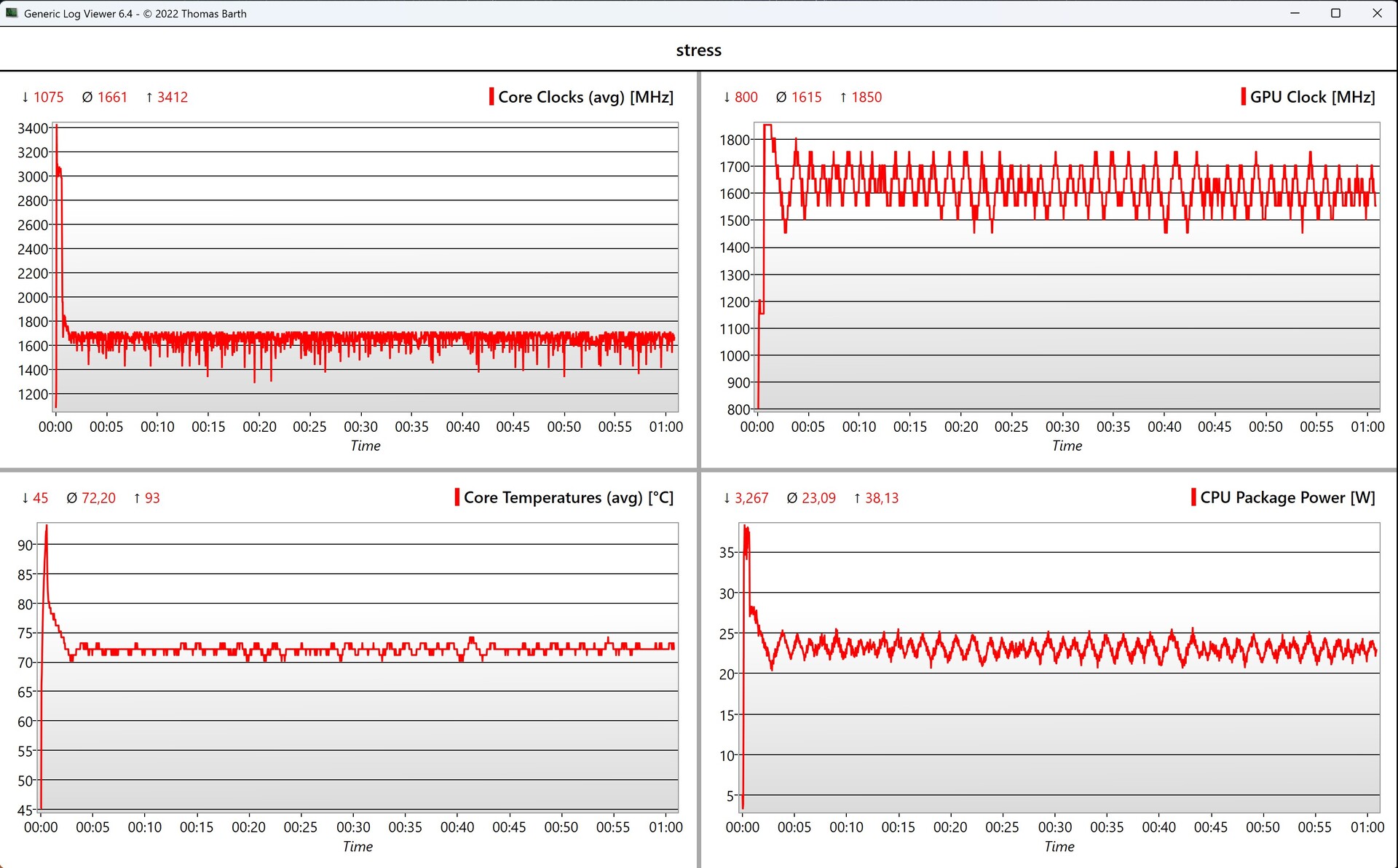 新机型比前代机型明显更经济,尤其是在空闲模式下,我们测得的最大功耗为 5.4 瓦。我们在压力测试中测得的最大功率为 63 瓦,很快就稳定在约 45 瓦。