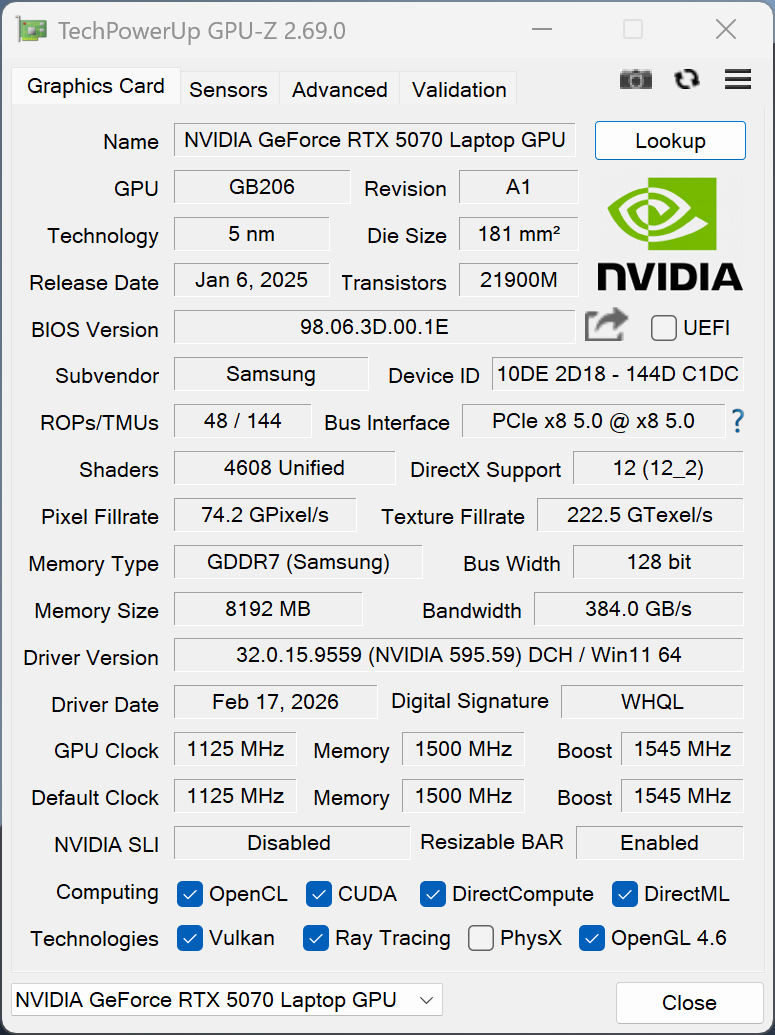 | Samsung Galaxy Book6 Ultra Ultra 7 356H, GeForce RTX 5070 Laptop, Samsung PM9C1b MZVL81T0HFLB-00BH1, OLED, 2880x1800, 16" | Apple MacBook Pro 16 2024 M4 Pro M4 Pro 14-Core, M4 Pro 20-Core GPU, Apple SSD AP2048Z, Mini-LED, 3456x2234, 16.2" | Lenovo Yoga Pro 9i 16 RTX 5070 Ultra 9 285H, GeForce RTX 5070 Laptop, WD PC SN7100S SDFPMSL-1T00-1101, OLED, 3200x2000, 16" | Asus ProArt P16 RTX 5090 Ryzen AI 9 HX 370, GeForce RTX 5090 Laptop, Micron 2500 2TB MTFDKBA2T0QGN-1BN1AABGA, OLED, 3840x2400, 16" | Dell 16 Premium DA16250 Ultra 7 255H, GeForce RTX 5070 Laptop, Kioxia BG6 KBG6AZNV1T02, OLED, 3840x2400, 16.3" | Lenovo ThinkPad T1g Gen 8 21TD003GE Ultra 9 285H, GeForce RTX 5070 Laptop, Samsung PM9E1 MZVLC2T0HBLD, Tandem-OLED, 3200x2000, 16" | Average NVIDIA GeForce RTX 5070 Laptop | Average of class Multimedia | |