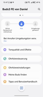 三星Galaxy Buds3 FE 的 11 毫米驱动器产生的声音相对均衡,低音略有增强,中音清晰,高音则有些过于突出。尽管如此,对于真正的无线耳机来说,三星耳塞还是能提供相当均衡的声音。 Galaxy 人工智能还能通过兼容设备上的头部追踪功能实现空间音效(360 音频),应用程序中的均衡器调整功能提供了 "动态 "或 "低音增强 "等预设值,以便进行微调。发烧友可能会感到失望,但对于日常使用,三星提供的整体方案还是很有吸引力的。