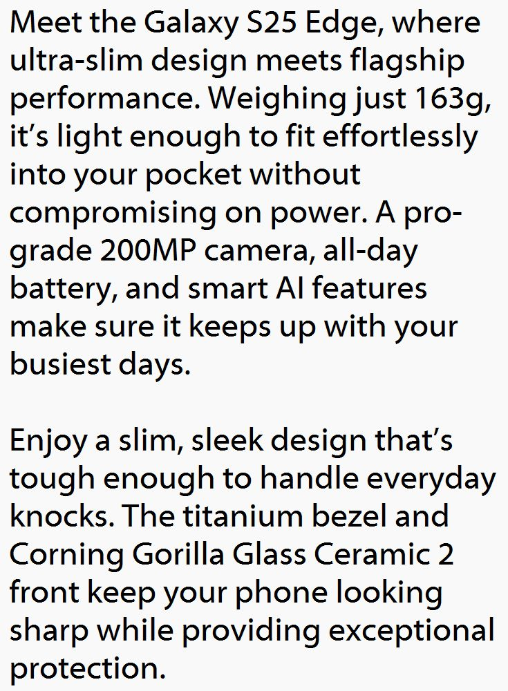 不过,新的传言为前者提供了新的信息。例如,Evan Blass和Sammyguru似乎提前拿到了Galaxy S25 Edge 的宣传资料。下面是 Blass 泄露的资料,其中显示了 S25 Edge 的硬件亮点,如 5.8 毫米的机身厚度、163 克的重量以及由康宁大猩猩陶瓷玻璃 2 保护的显示屏。由此看来,Galaxy S25 Edge 将是首款采用康宁大猩猩陶瓷玻璃后续产品的手机。