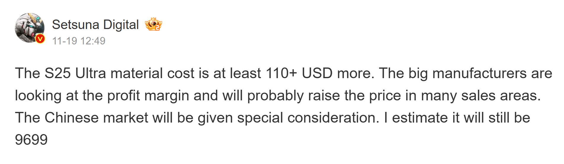 这一消息来自微博爆料人 Setsuna Digital。该爆料者称,Galaxy S25 Ultra 的制造成本比前代产品至少高出 110 美元。如果消息属实,那么增加的物料成本(BoM)最终会抬高这款智能手机的零售价。