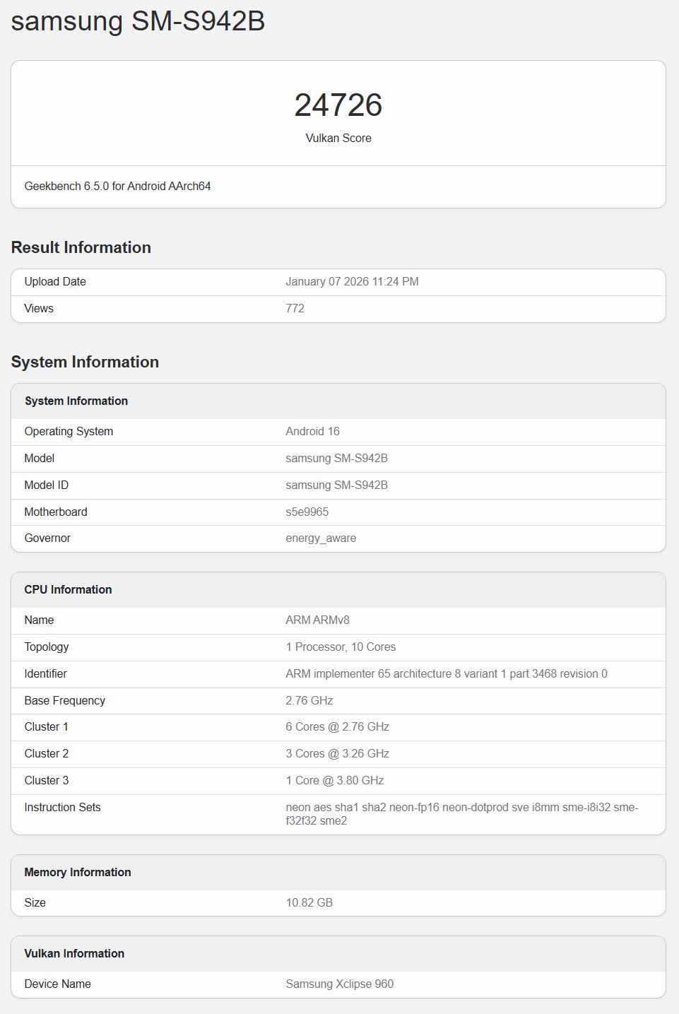 三星 Exynos 2600 测试设备过去已经出现在 Geekbench 上,并给出了预期的 CPU 性能指标。现在,一款型号为 SM-S942B 的三星智能手机也出现在Geekbench 数据库中。.这款手机预计是国际版Galaxy S26。从参数可以看出,它采用了三星 Xclipse 960 的 10 核 SoC,这意味着它显然是 Exynos 2600。这也很明显地暗示欧洲版Galaxy S26 将采用三星自家的处理器。