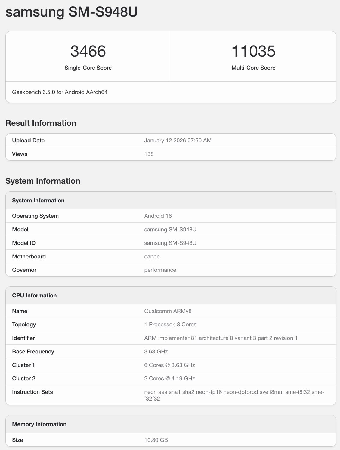 爆料人 Ice Universe 在X 上发现了一份新的 Geekbench 列表。Galaxy S26 Ultra 的初步基准测试成绩。列出的是美国型号的 Galaxy S26 Ultra型号为 SM-S948U。它配备 12GB 内存,运行Android 16 操作系统。