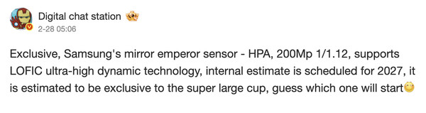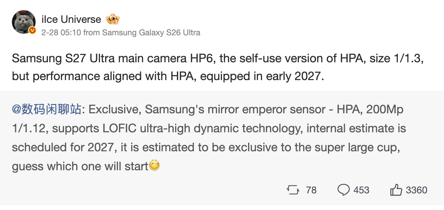 Digital Chat Station 和 Ice Universe 对 ISOCELL HPA 的传感器尺寸存在分歧。目前,这两家公司分别报告了 1/1.12 英寸和 1/1.3 英寸的传感器尺寸。此外,Ice Universe 还认为三星也会在Galaxy S27 Ultra 中将 ISOCELL HPA 宣传为 ISOCELL HP6。现阶段,我们预计相机硬件细节要到 2026 年底才会确定。