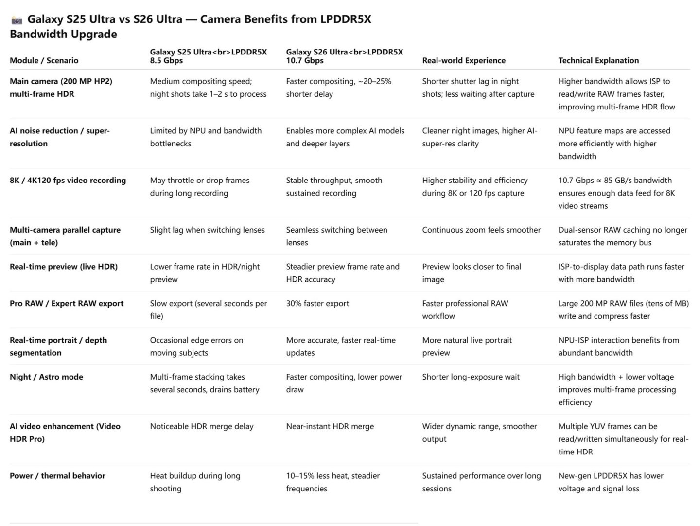 值得注意的是,这些内存配置与Galaxy S25 系列相同,但不再有 128 GB 存储选项。看来三星决定不为Galaxy S26 系列升级内存容量。尽管如此,同一泄密者在上周 上周提到LPDDR5X 内存的运行速度高达 10.7 Gbps,而目前这一代的速度为 8.5 Gbps。这将使夜景照片的处理速度更快,弱光照片的噪点更少,专业视频的动态范围更广,以及其他一些摄像头方面的改进。