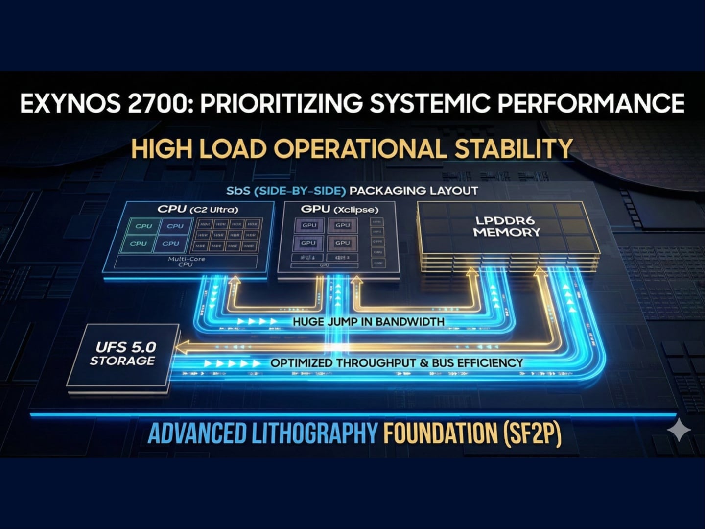 至于预计的 Geekbench 分数,Exynos 2700 的单核性能比 Exynos 2600 高 40%,多核性能比 Exynos 2600 高 30%。它还采用了统一的铜质热路径块(HPB),采用 FOWLP-SbS(并排)封装设计,这是对第一代 Exynos 2600 的升级。这使得 DRAM 靠近芯片,而散热器(HPB)则覆盖这两个组件。除了 CPU 之外,下一代 Xclipse GPU 也将升级,LPDDR6 RAM 和 UFS 5.0 存储器的数据传输速度将提高约 80% 至 100%,性能提升高达 40%。