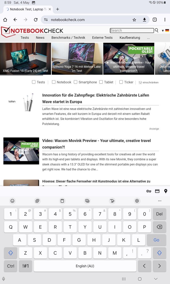 在我们的 WiFi 测试中,使用激活的 5 GHz 连接,传输速度仍然低于 500 MBit/s,这可能表明没有集成所宣传的 VHT80 频道。相比之下 Galaxy A34 5G在使用 VHT80 时的最高传输速率接近 700 MBit/s。在使用我们的参考路由器华硕 ROG Rapture GT-AXE11000 时测得的传输速率比较稳定,但仍明显低于 WiFi6 竞争对手(例如:华硕 ROG Rapture GT-AXE11000)。小米 Pad 6, Galaxy Tab S9 FE).