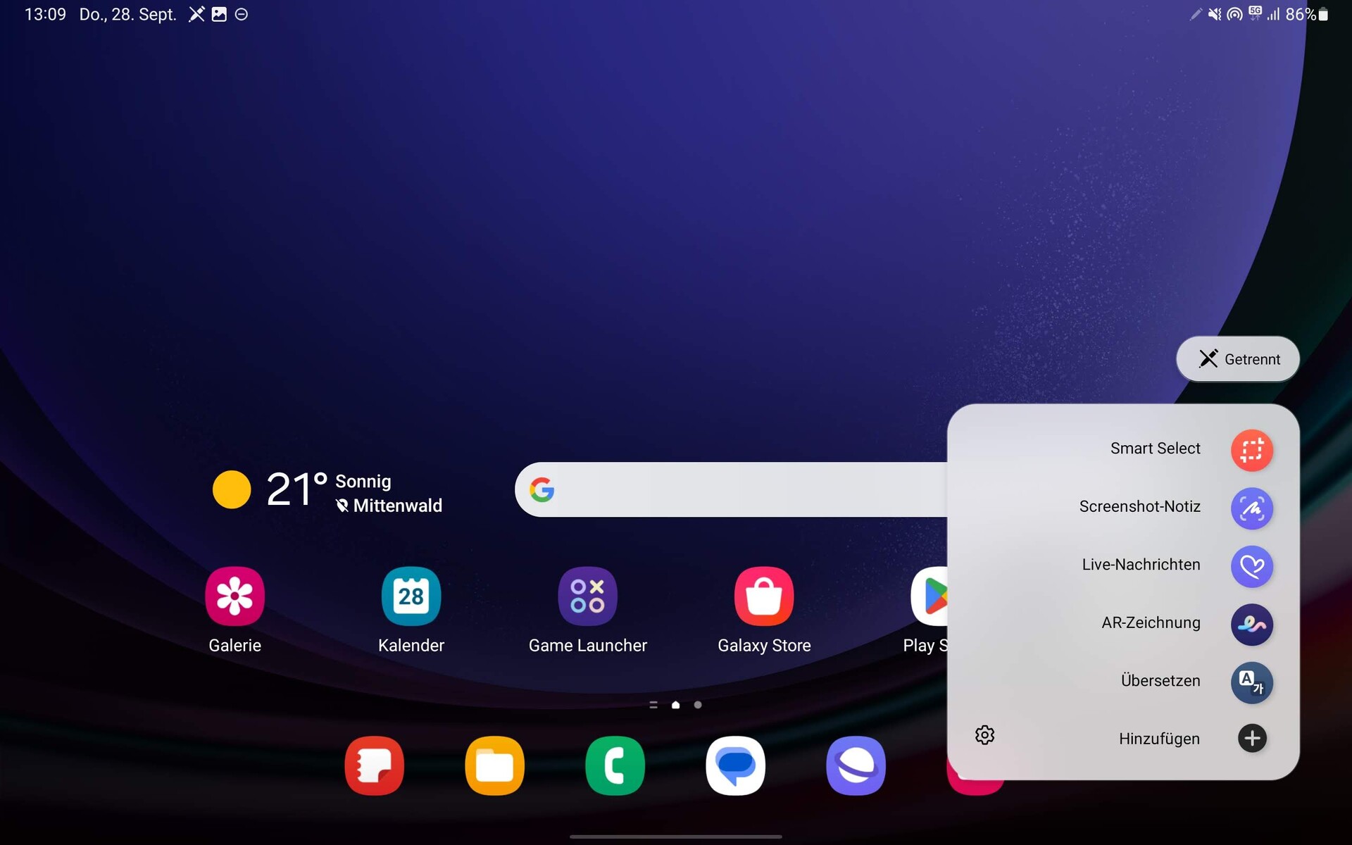 S-Pen 的许多功能也令人印象深刻。通过简短的菜单可以访问链接的应用程序和操作。活动笔上还有一个按钮,可以链接到各种附加功能和应用程序。还支持在锁屏上书写。在分屏模式下打开多个应用程序时,还可以使用更多应用程序。不过,由于没有盖子,笔放在平板电脑背面得不到保护,很容易丢失。