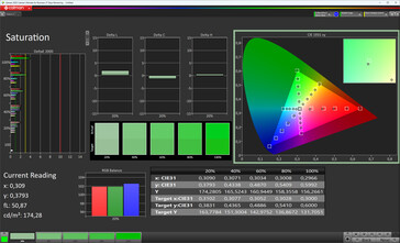 三星平板电脑的最大亮度规定为 950 尼特,但在 APL18 测试中,我们只能达到 900 cd/m² 的亮度。在适用于 HDR10+、HDR10 和 HLG 的面板上,HDR 内容的显示效果也相应吸引人。在没有任何暗区的纯白色显示屏上,AMOLED 显示屏在我们的测量中达到了 625 cd/m² 的稳定最高值。