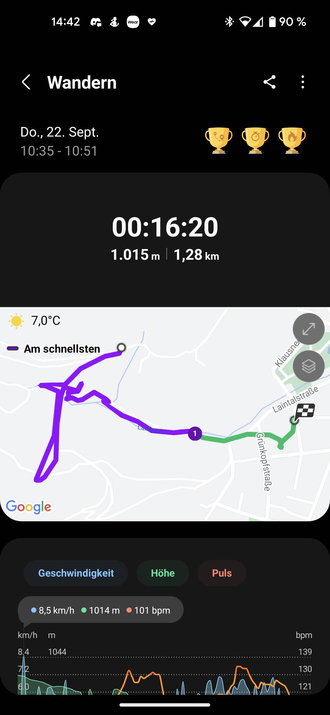 在开始锻炼时,Watch5 Pro会在几秒钟内建立起与卫星网络的连接。由于相应的天线是内置在手表中的,因此不需要与智能手机进行配对。轨迹记录非常准确,三星的智能手表在与Garmin Venu 2的自行车骑行对比中证明了这一点。路线长度非常相似,在大多数情况下,地图上的表示甚至比Garmin手表更准确。