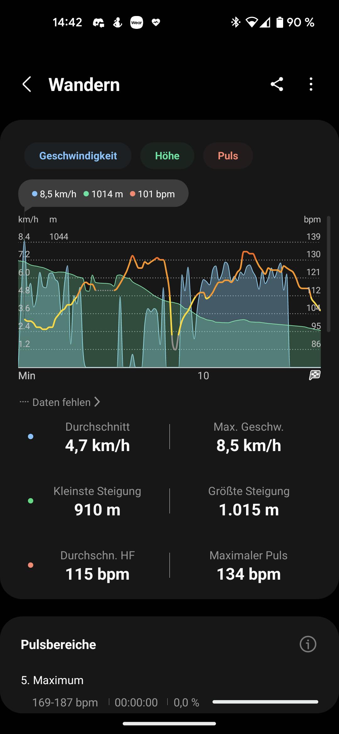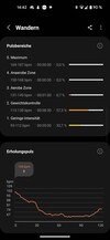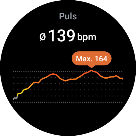 完成的锻炼可以在手表和智能手机上查看。完成的距离以数字和地图的形式显示。速度、高度和脉搏(徒步)也可以用图形显示。此外,还显示个别脉搏范围和其中的时间,以及锻炼后的恢复脉搏,部分距离的时间,以及其他有关锻炼的细节。