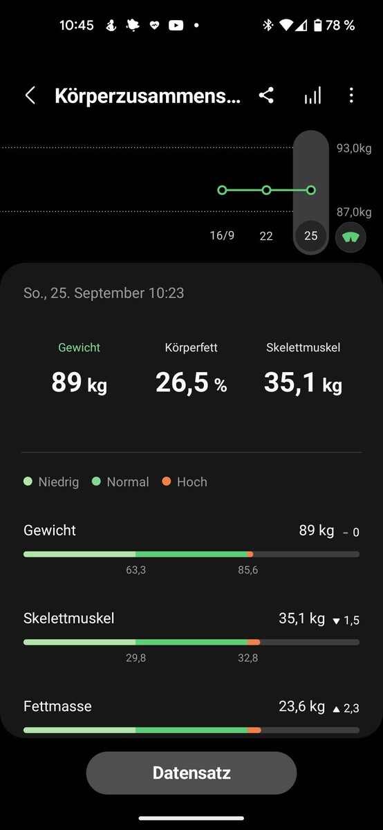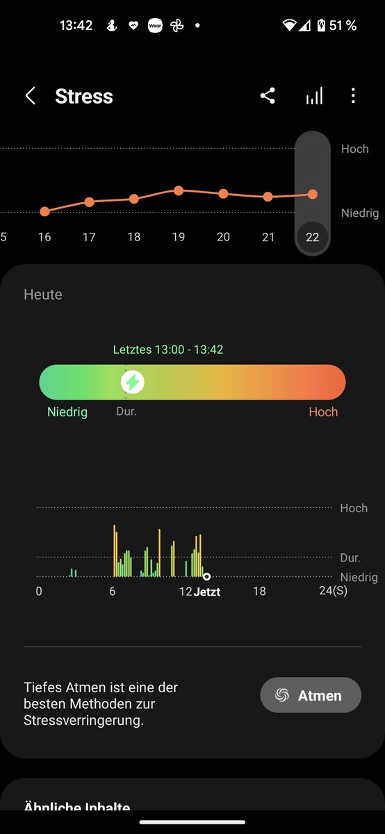 三星Galaxy Watch5 Pro的健康功能的中心平台是三星健康应用程序。该程序在主页上汇编了所有的基本数据,并通过熟悉的圆圈--在三星的情况下,它们是心脏--提供了日常活动的概述,运行的步骤,过去的锻炼概述,睡眠数据,脉搏,压力水平,身体成分,以及血氧饱和度。点击各个元素可以打开一个子菜单,并提供过去几天、几周或几个月内的步数概览。