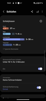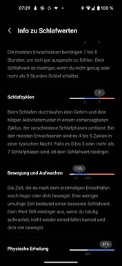 该软件以各种图表的形式显示睡眠及其各个部分。此外,睡眠质量还可以通过睡眠值来评估。该值然后根据年龄组进行分类,并对其组成部分进行细分。三星的软件还提供与智能手机结合的打鼾检测。三星在睡眠教练中对收集的数据进行评估。一周后,睡眠行为被分配到某个计划中。如果手表在夜间佩戴超过四个星期,三星希望提供进一步的提示,让人们在夜间休息。