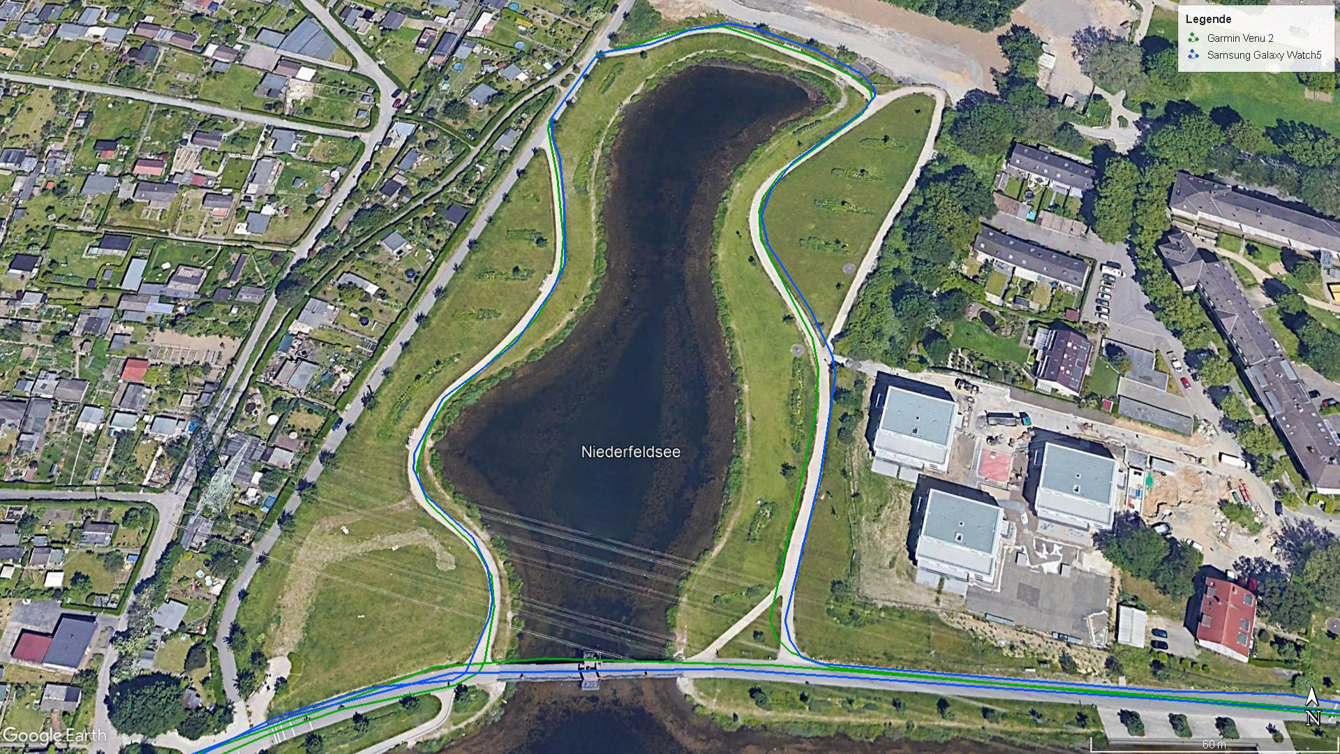 为了检查GPS测量的准确性,我们把Galaxy Watch5与我们的参考设备Garmin Venu2一起骑车。记录的结果令人印象深刻,两个钟的测量距离非常接近,在地图上的表现显示,即使在弯道和转弯时,路径也被很好地追踪。