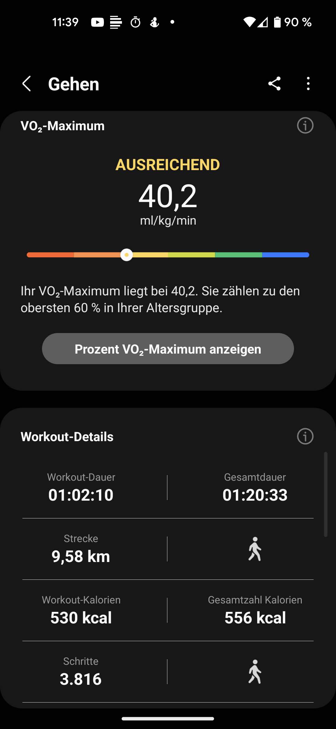 如果你愿意,Galaxy 智能手表还可以在完成某些时间或距离后给出中间状态报告。 跑步时的心率和过去一公里所需的时间等信息,既可以在显示屏上直观地显示,也可以通过扩音器播报。此外,健康应用程序列出了每公里的时间和数据,并显示VO2max值。