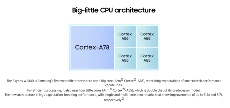 Exynos W1000 采用先进的 3 纳米技术制造它配备了强大的 5 核 CPU 配置。处理性能最出色的是主频为 1.6GHz 的 Cortex-A78 内核,它还有四个主频高达 1.5GHz 的 Cortex-A55 内核。根据三星的说法,它在应用程序启动时间方面有很大的性能提升,速度提高了 2.7 倍,单核性能提高了 3.4 倍,多核操作加快了 3.7 倍。