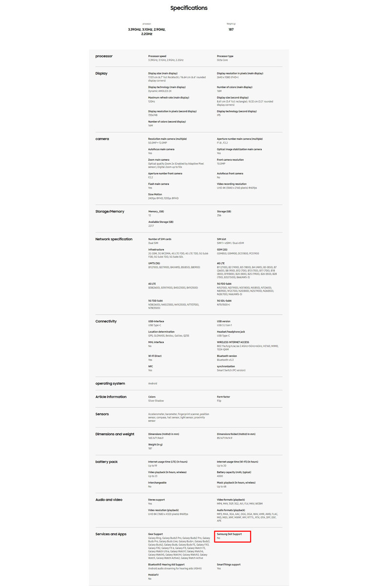 因此,人们期望Galaxy Z Flip6 的功能能与较大的Galaxy S 和Galaxy Z 相匹配。为此,三星为今年的Galaxy Z Flip 配备了一个 USB 3.2 Gen 1 端口,很可能就是XDA Developers 验证过的那个 USB 3.2 Gen 1 端口。的读取速度高达 1.7 Gbps。 Galaxy Z Flip5.不过,Blass 泄露的规格表证实,Galaxy Z Flip6 将不支持三星 DeX,就像它的前身和其他所有Galaxy Z Flip 机型一样。在现阶段,三星似乎正在利用 DeX 支持来区分Galaxy Z Flip6 和价格更高的Galaxy Z Fold6,尽管前者的零售价可能高于后者。 Galaxy S24尽管前者的零售价可能高于同样支持三星 DeX 功能的 S24。