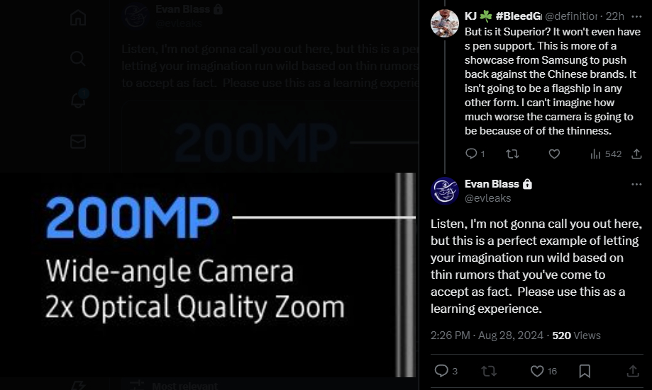 随后,布拉斯在推特上公布了Galaxy Z Fold 特别版的所谓尺寸,这与早先人们对该设备比 Z Fold 更薄、但比 Z Fold 更宽的预期不谋而合。 Galaxy Z Fold6.此外,他现在还引发了一种猜测,即前者可能会"大幅提升摄像头"。这应被视为 的 "顶级"。并有可能与"相媲美的 Galaxy S24 Ultra.具体来说,Blass 分享的一张图片可以推断为Galaxy Z Fold 特别版,配备 200 MP 主摄像头。
