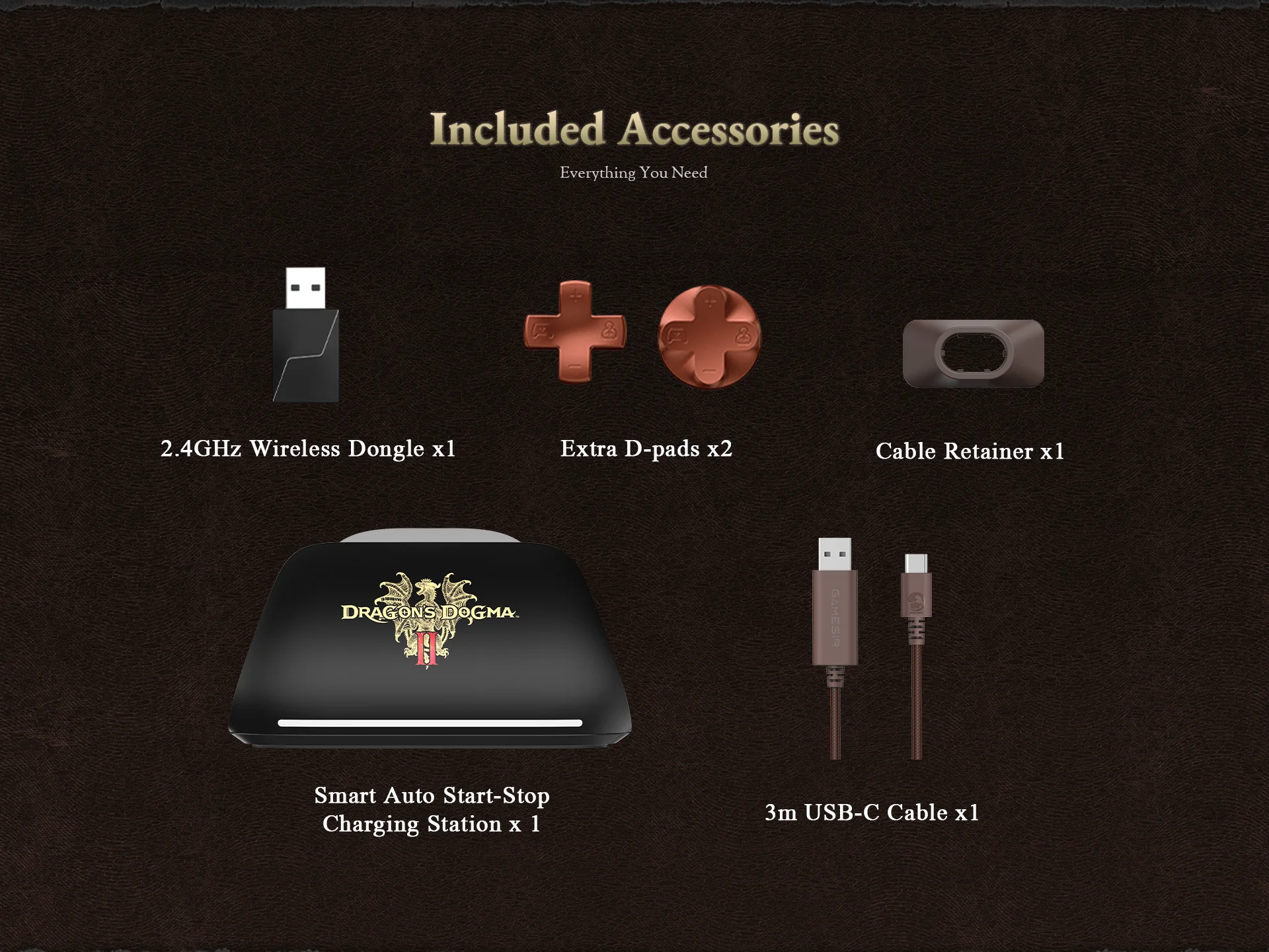 除控制器和充电底座外,购买者还可获得一个 2.4GHz 无线加密狗、两个不同设计的额外 D-Pad、一个线缆固定器和一条 3 米长的 USB-C 至 USB-A 编织线缆。