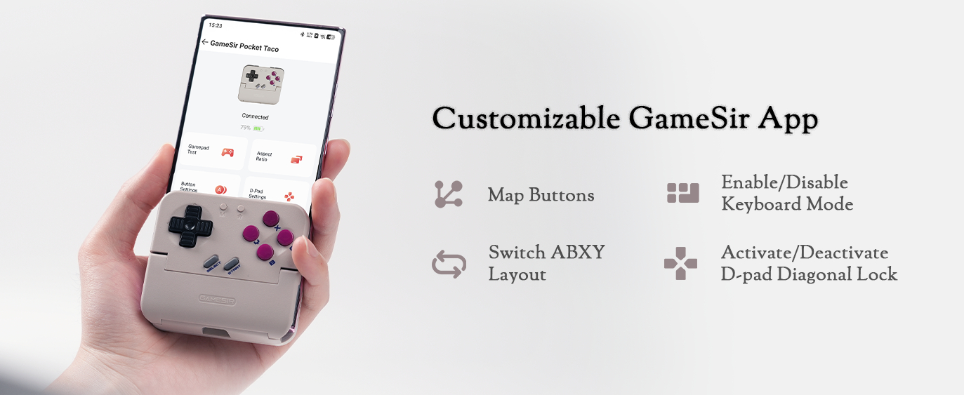 该控制器可与 GameSir 应用程序配合使用,GameSir 应用程序为用户提供了大量自定义选项,例如调整纵横比/显示屏缩放比例、修改按键布局(Switch 或 Xbox)、交换 L1 和 L2 键或 R1 和 R2 键、启用 D-pad 对角锁定以及激活键盘模式。
