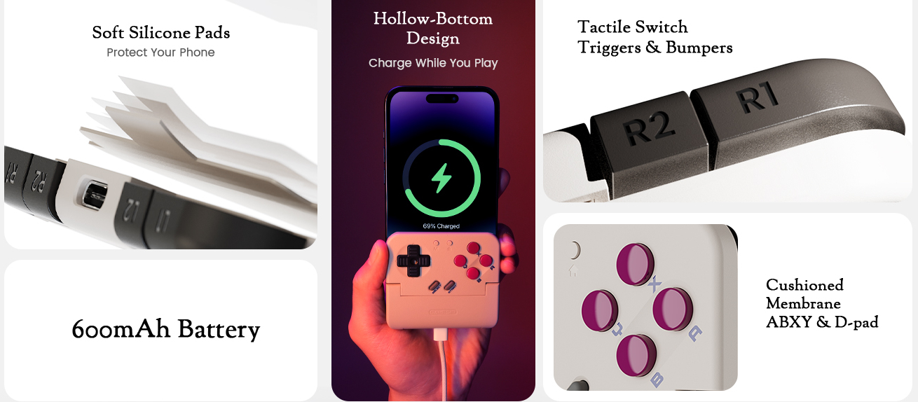 GameSir Pocket Taco 重 62.2 克,内置 600mAh 电池容量,可提供数小时的游戏时间。手柄底部还有一个空心设计,可以与手机端口对齐,方便你穿入充电线,这样你就可以边玩边充电了。
