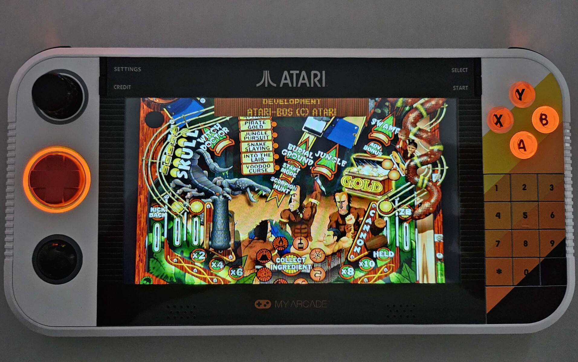 每款游戏都提供多种控制配置,可在游戏过程中随时查看和调整。由 Atari 和 My Arcade 开发的名为 SmartGlow 的照明功能可以用颜色突出显示当前激活的控件以及所选游戏需要的控件。7 英寸(约 18 厘米)的显示屏对于复古游戏来说已经足够大了,尽管许多老游戏并没有充分利用屏幕。通过设置,您可以保持原来的宽高比,也可以拉伸图像使其充满显示屏--不过后者自然会带来失真。