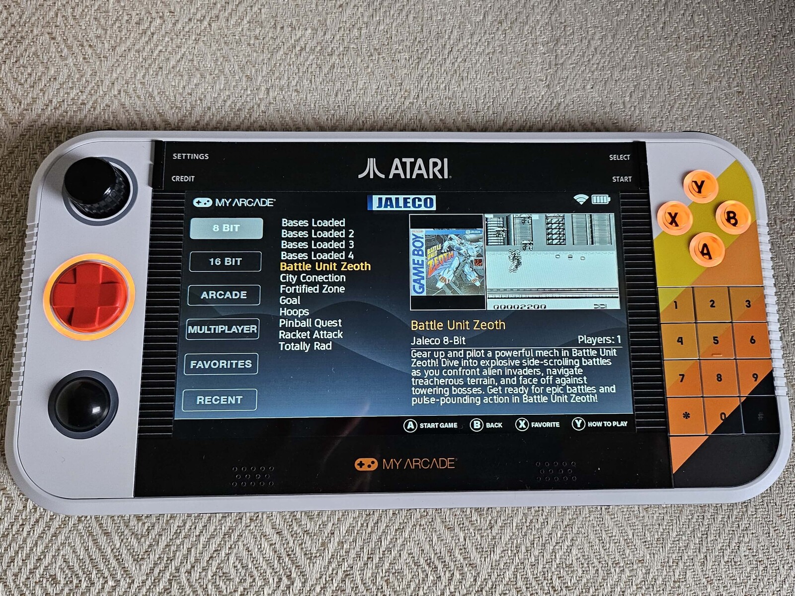 内置的 200 款游戏迎合了广大玩家的需求,真正做到了人人有得玩。除了雅达利自己的游戏外,该系统还包括几款来自 Piko 和 Jaleco 的游戏,但不清楚为什么会选择这些游戏。菜单中显示的每款游戏都配有原始封面图,例如 Game Boy 版本的《Battle Unit Zeoth》,同时还有一段自动播放的视频短片和英文说明。主菜单分为Atari Recharged、Atari、Balls of Steel、Pac-Man、Jaleco、Piko 和 Settings 等类别。子菜单进一步将游戏库分为 8 位、16 位、街机、多人游戏、收藏和最近播放。任何熟悉 RetroArch 或 Retro Deck 等前端软件的人都会有宾至如归的感觉:一切都结构整齐,启动迅速。