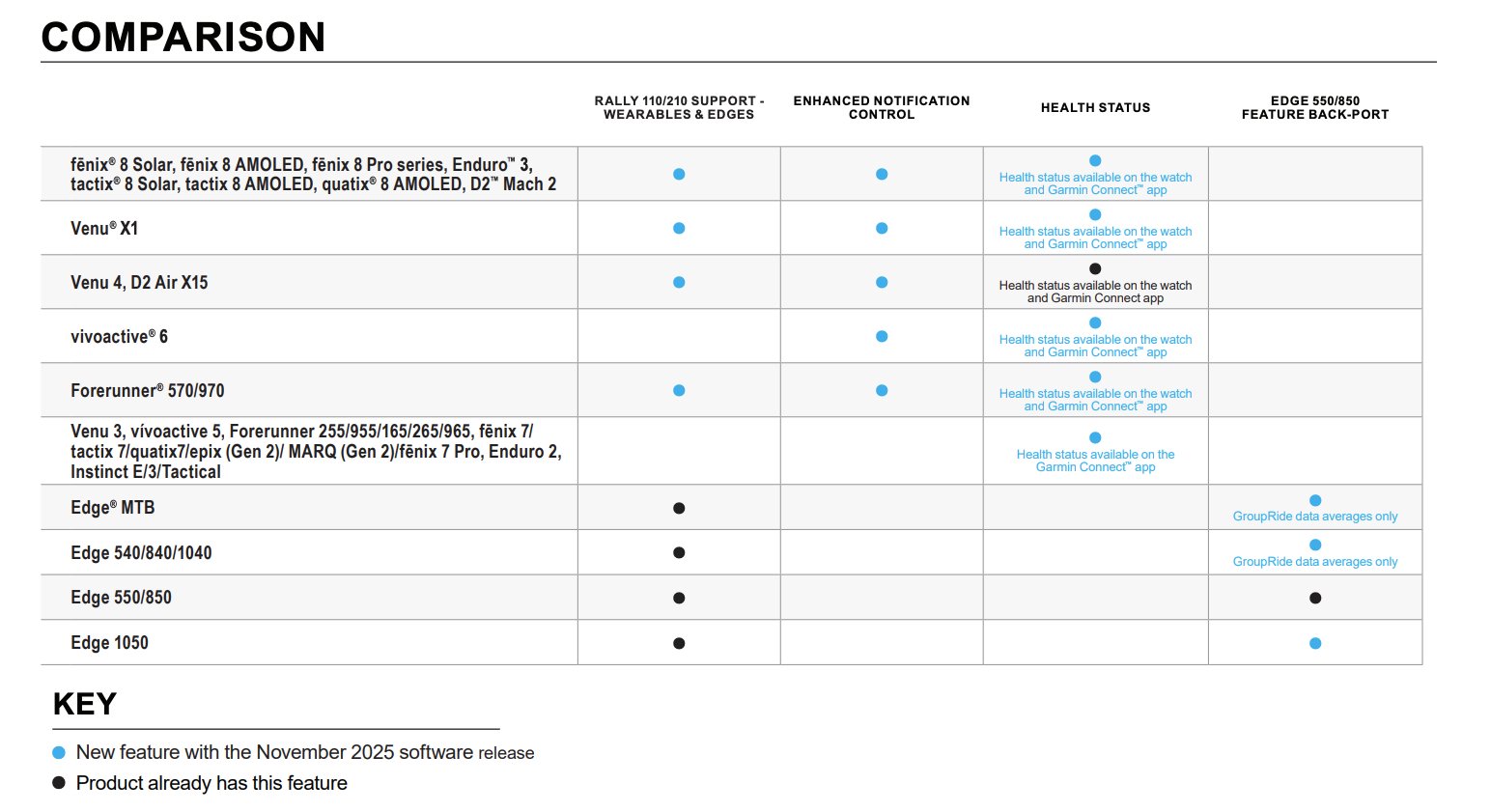 至于 Garmin 的其他最新功能更新,很多都是针对其骑行电脑系列的,如智能加油和齿轮比分析。此外,Garmin 还为 Fenix 8、Forerunner 970、Venu 4 和 Venu X1 等相关智能手表提供了增强的通知控制功能。此外,Garmin 还在 2025 年 11 月的功能更新中为众多可穿戴设备添加了 Rally 110 和 Rally 210 支持,如上图所示。