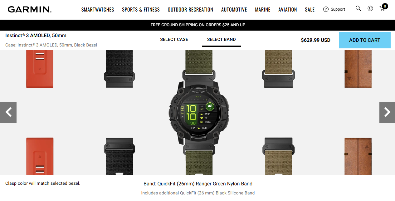 不过,有 37 种表带可供选择。有多种硅胶或尼龙制成的彩色表带,以及栗色皮革表带;价格从 499.99 美元到 649.99 美元不等。需要提醒的是,标准版手表在亚马逊的起价为 499.99 美元。目前还不清楚 Garmin 是否或何时会为客户个性化 Instinct 3 增加更多选项。