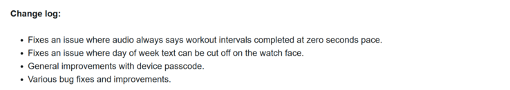 该测试版还修复了两个错误。第一个是解决了某些表盘上的星期文字被截断的问题。第二个问题是解决了锻炼过程中的音频相关问题;在零秒的节奏下,音频会显示锻炼间隔已完成。最后,发布说明中还提到了其他一些小的错误修复和改进。